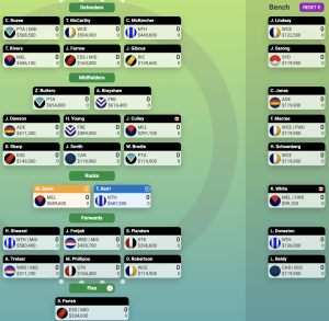 Twenty of my players are owned by over 40% of all coaches (21 if you count Erroll at 39%), which certainly screams cookie cutter, but I’m hoping the less than 21% owned in Walsh, Buderick, McCarthy, Rachelle, Rivers and Brayshaw can make a difference. I reckon there might be thirteen keepers in there which I’m OK with, but the seven mid pricers may be a stretch. What do you think? Let me know your thoughts and comments as I can still be swayed on a couple of these selections.